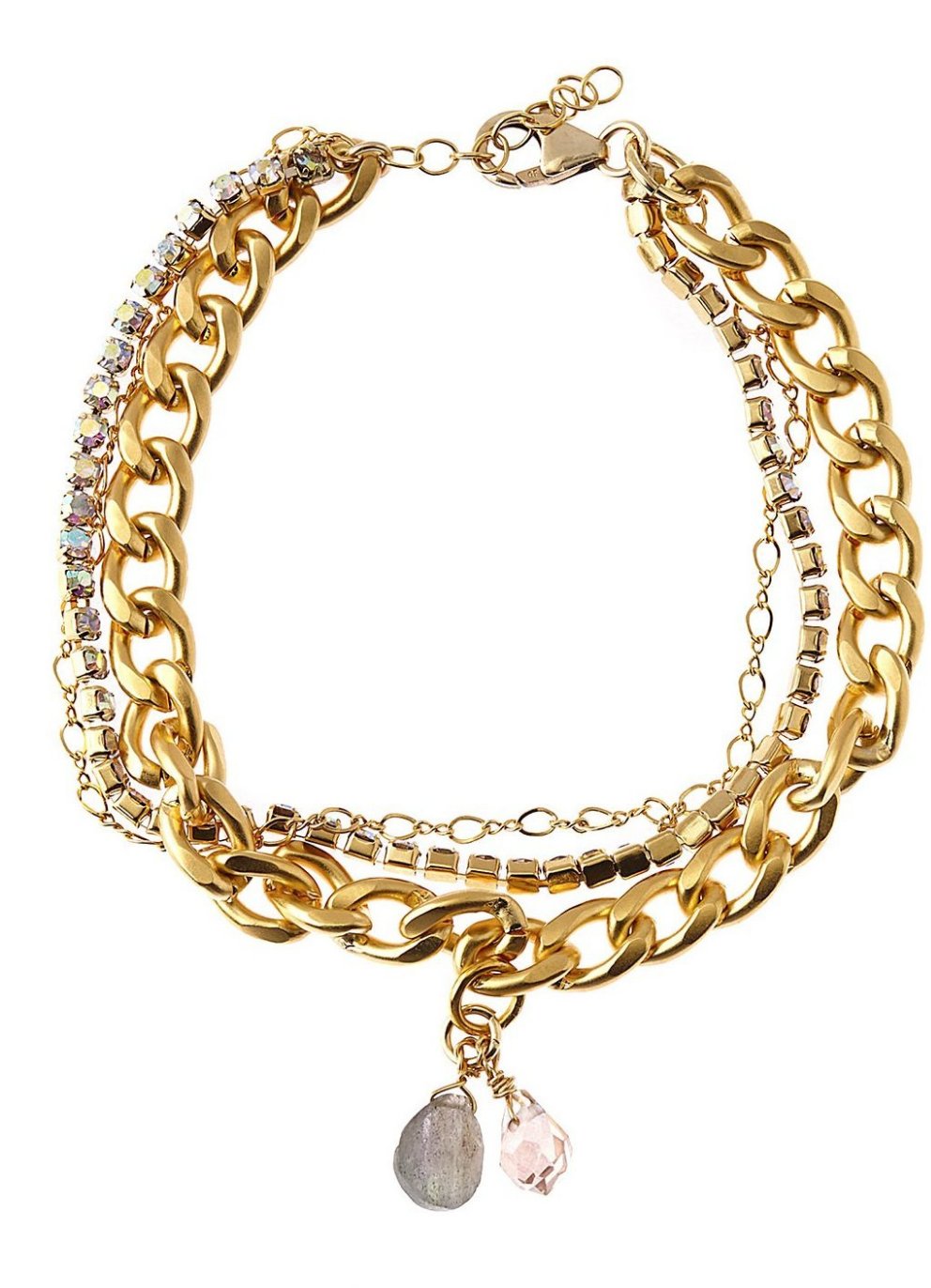 A special mix of matte/brushed gold chain with an iridescent crystal link chain, wants to shimmer and shine on your hand for the everyday occasions of life. With a genuine mini labradorite stone, this alluring piece will surely brighten and empower your day!